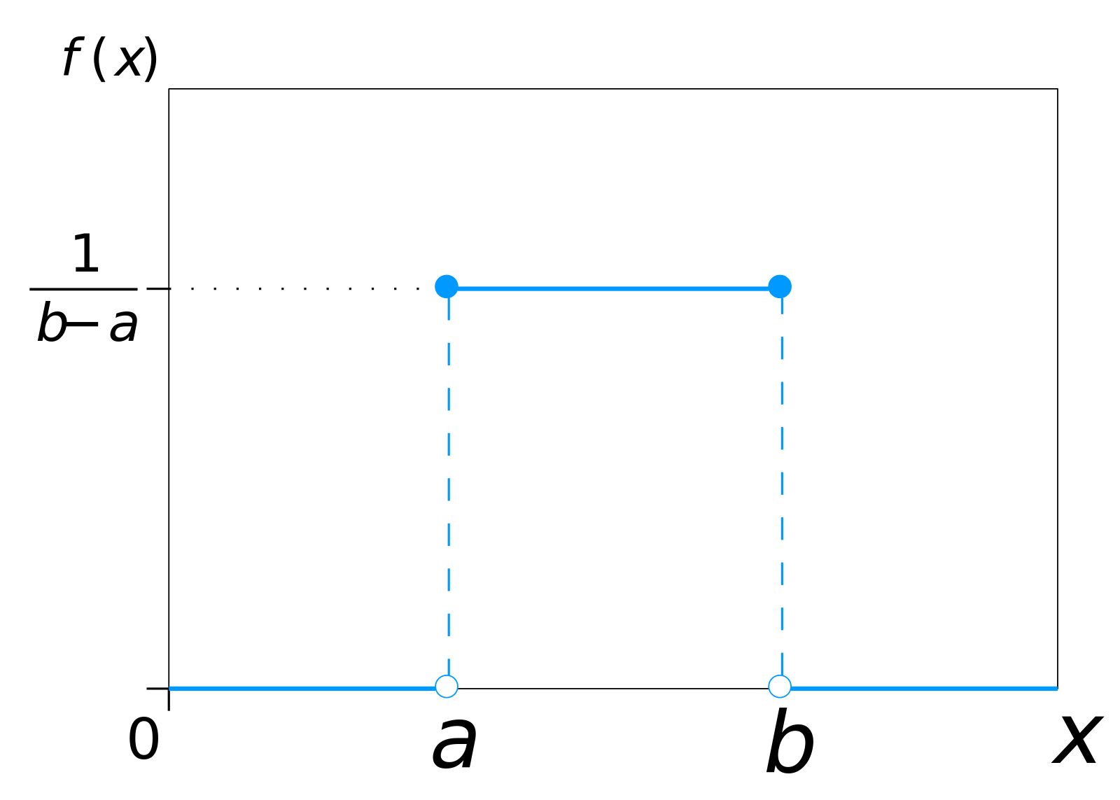 • Continuous Uniform Distribution: {% math %}f(x) = \frac{1}{b - a + 1}{% endmath %}